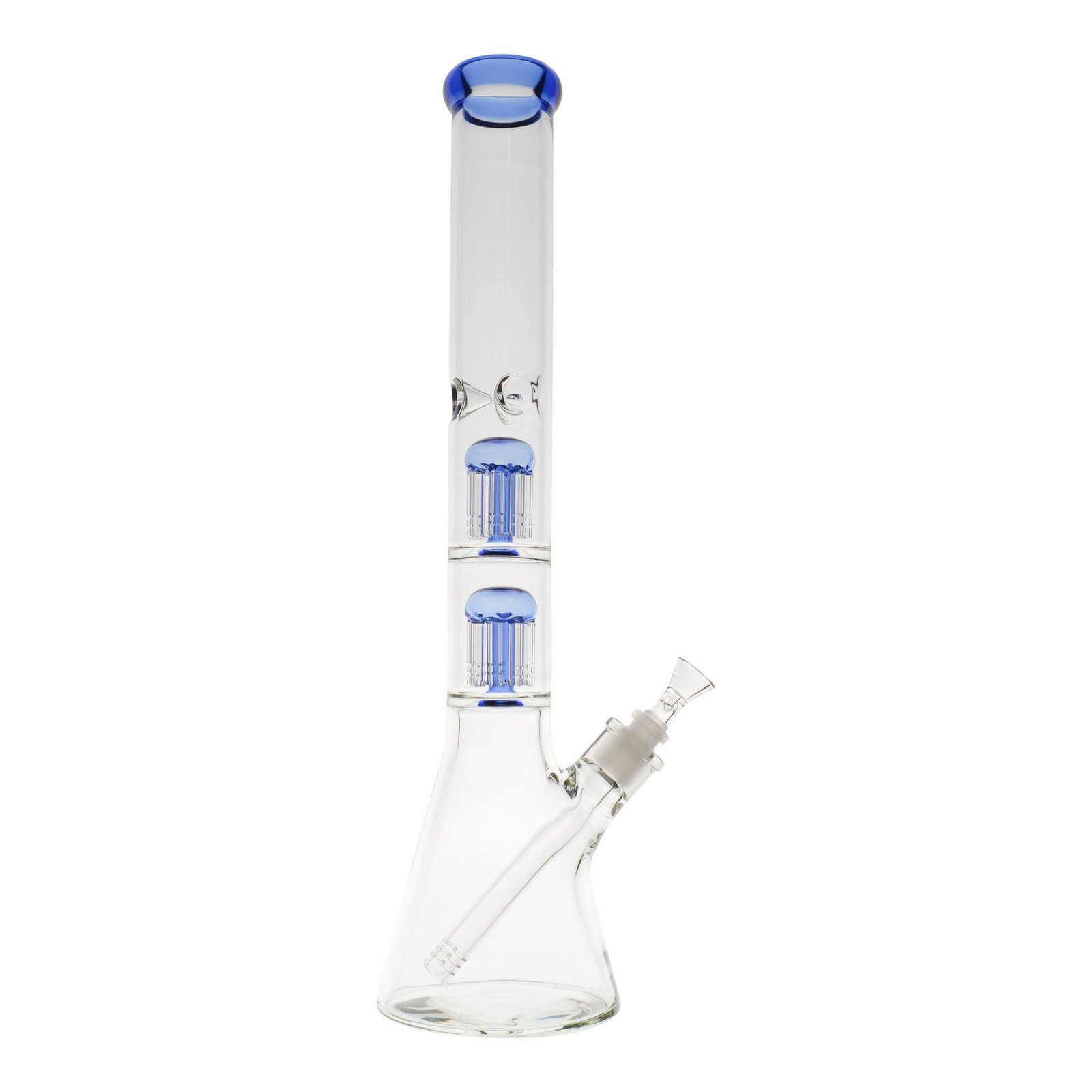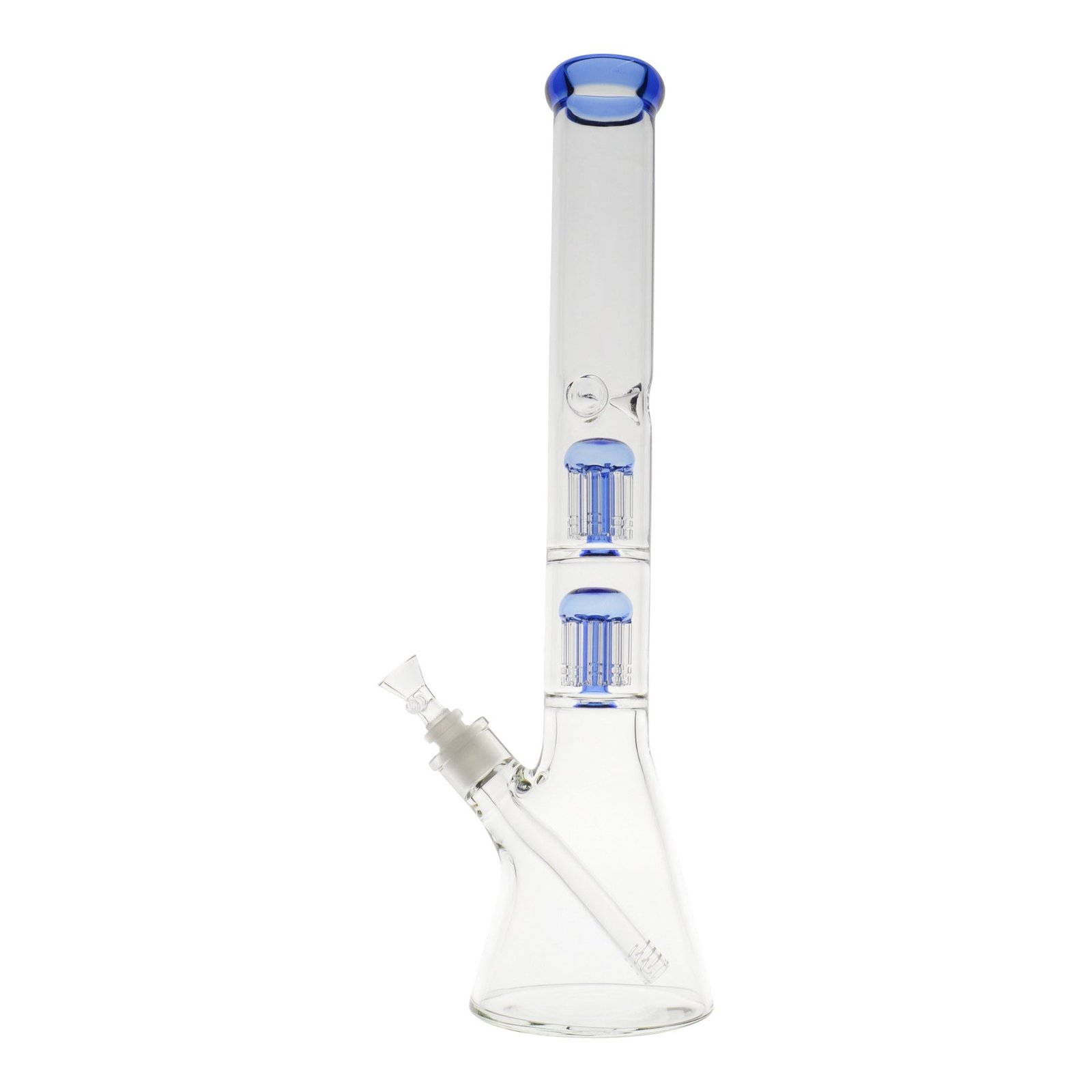 The stable, bottom heavy design of the Double Colored Tree Perc Beaker makes accidental tips a thing of the past. Perfect for passing, this 18-inch glass bong is transparent with pops of blue, purple, or teal accents. The stacked dual tree percolators and diffused downstem generate lots of bubbles for serious filtration and comfortable rips. To soften the smoke even further, add a few ice cubes to the built-in three pinch ice catcher so you can puff away all day long. This water bong also includes a clear funnel-shaped smoking bowl with a handle to make removing it a cinch.