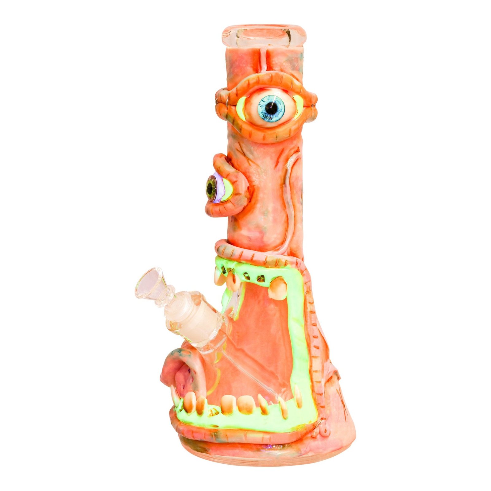 Watch your back when taking rips from this unique bong. It isn’t because of the monster that might sneak up behind you, it’s the stoners you have to worry about. They’ll be drawn to the intricate detail and neon glow-in-the-dark effect of this crazy eyed zombie monster bong like a two-for-one deal at the dispensary. The flat beaker base makes this 12.5-inch water bong extremely stable and easy to pass around if you choose to do so. Included is a 14mm male bowl and a 4.5-inch glass downstem that fits the built in 45-degree angled female joint.