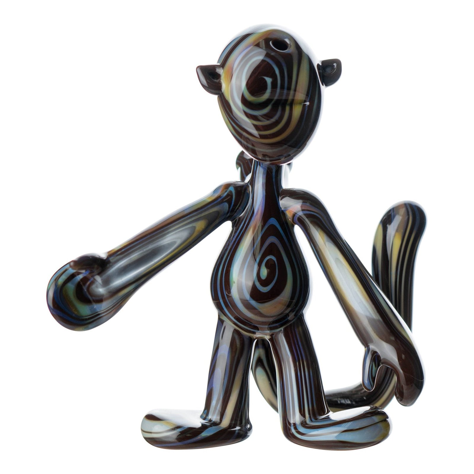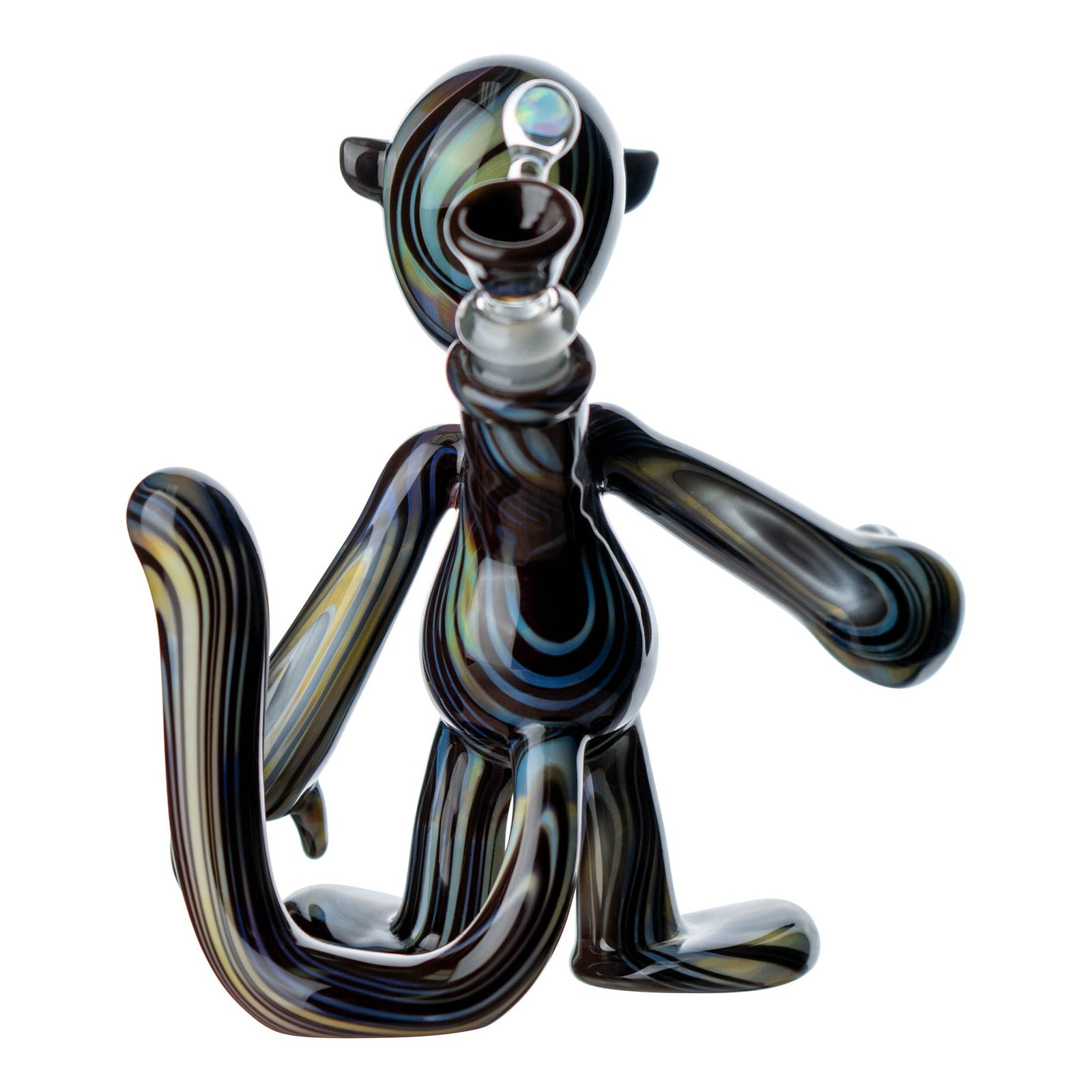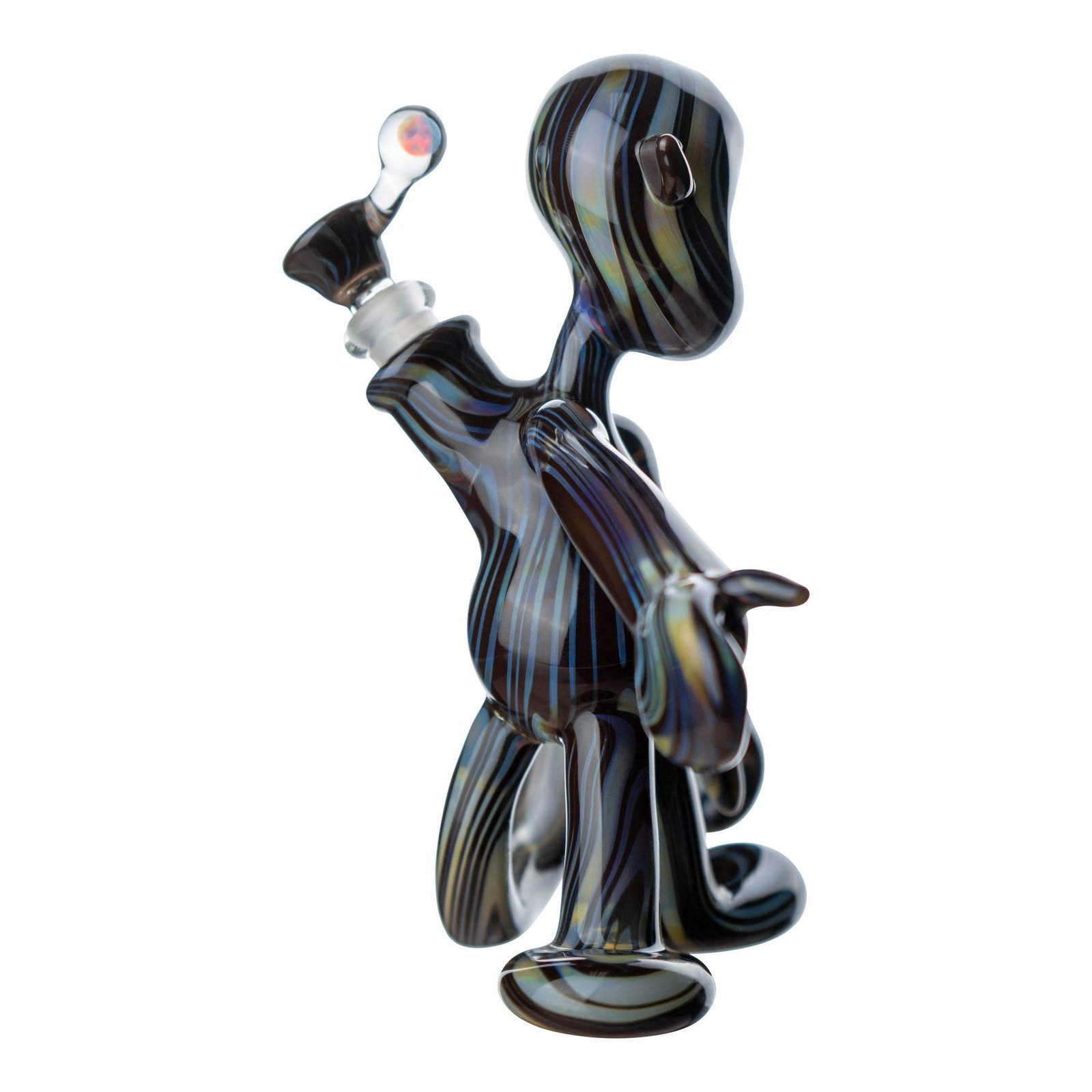 Cute, yet mysterious, these faceless characters are so intriguing that after a few bong rips you may find yourself mesmerized by their sleek humanoid form. The darker bong is blown with opaque glass in a gorgeous pattern that resembles natural wood grain, while the other plays on various shades of blue and clear with a few stripes of opaque turquois glass mixed between transparent bubble glass. You may just have to get the pair since the Matchstick Man heady glass bongs are designed so that they hold hands perfectly when standing up. You won’t want to separate a love match now would you? These one-of-a-kind functional art pieces were beautifully hand blow by glass artist Chris Hurley, a master of Venetian and scientific glass techniques. Made in the U.S.A., these heady glass bongs make for a unique art piece you’ll want to keep out on the table and are the perfect addition to any bong collection. Each glass bong includes a matching handmade bowl with a 10mm male joint and a pull dab for easy removal.