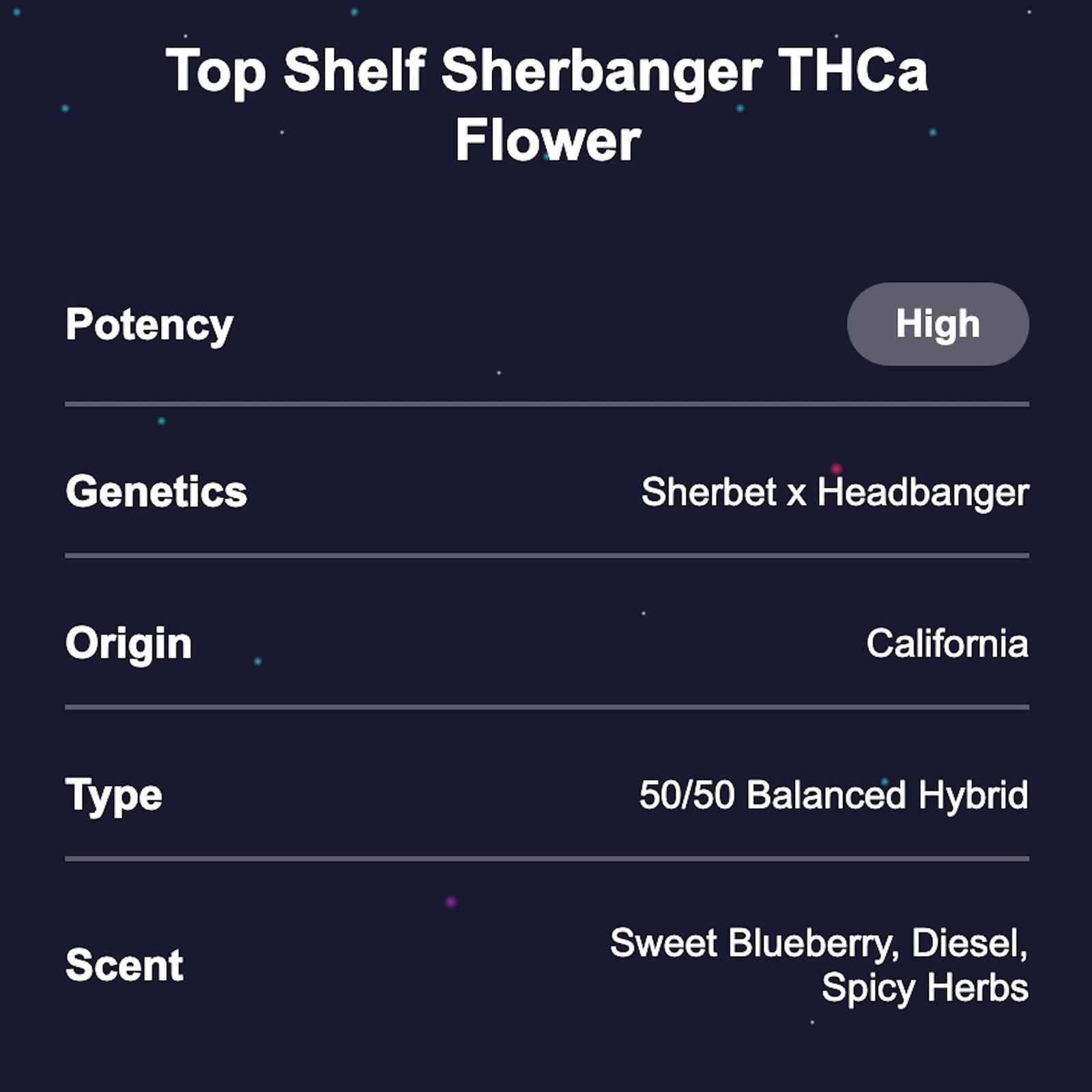 Ready to get absolutely sherbanged? This top-shelf Sherbanger THC-A flower is straight gas that’ll have you floating between worlds. Born from the legendary cross of Sherbet x Headbanger, this balanced hybrid delivers the perfect vibe whether you’re trying to chill or stay lifted. Each nug is dense, sticky, and absolutely caked in trichomes that sparkle like diamonds under the light. The flavor profile is next-levelβimagine creamy citrus meeting spicy herbs with a sweet blueberry gelato finish that’ll have your taste buds doing backflips. Whether you’re a seasoned stoner or looking to elevate your sesh game, Sherbanger brings those premium vibes without the premium price tag. Perfect for any time of day when you need that balanced buzz that keeps you grounded but still soaring.